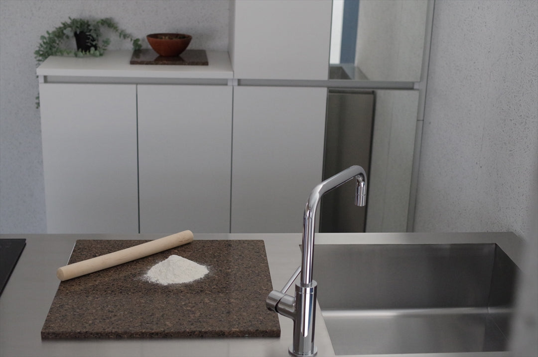 アクリル系の人造大理石に比べ、極めて本物の石に近い耐久性と質感を持っています。そして本物の天然石にはない表面の平滑性により、耐汚染性が高く、清掃もしやすい清潔な素材です。