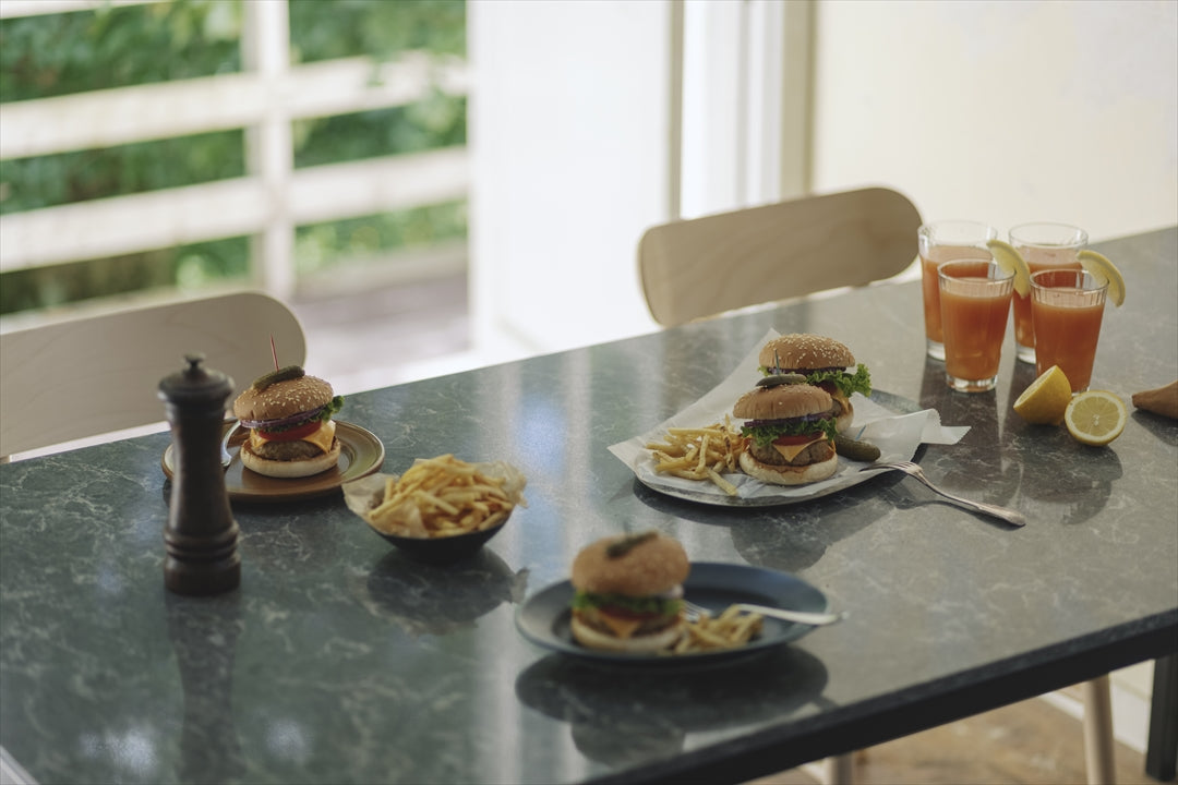 the table の素材であるシーザーストーンは人造大理石の中でも耐久性と表現力が高くクオーツを約90%含有した製品です。